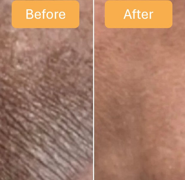 Many notice softer, smoother feel after the first use. More even tone and KP bump reduction typically appear over 2–4 weeks with regular use.